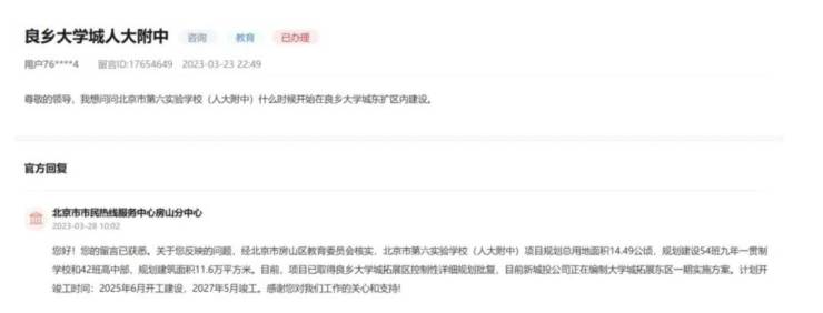 南侧一路之隔规划了清华附中高中部和九年一贯制的人大附中,2025年6月开始建设,2027年5月竣工。