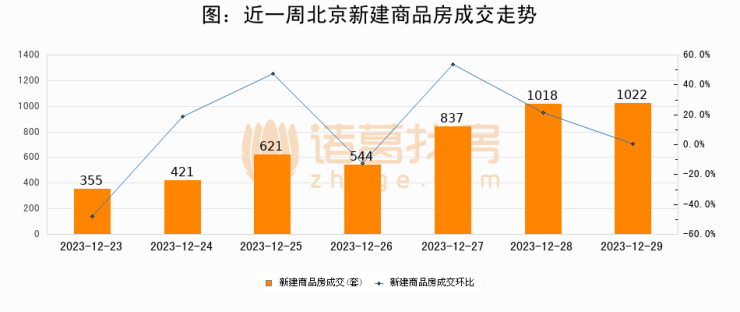 根据北京市住房和城乡建设委员会数据显示,2023年12月29日北京新建商品房成交1022套,较昨日增加4套,环比上涨0.4%