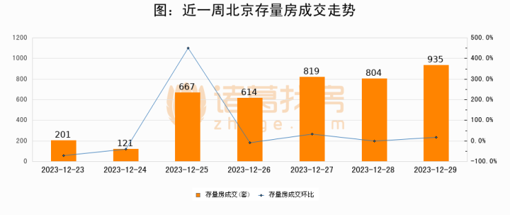 从存量房来看,2023年12月29日北京存量房单日成交935套,比昨日增加131套,环比上涨16.3%。从近一周存量房成交来看,北京存量房日均成交套数为594套,12月29日单日成交935套,高于近一周平均水平57.4%。