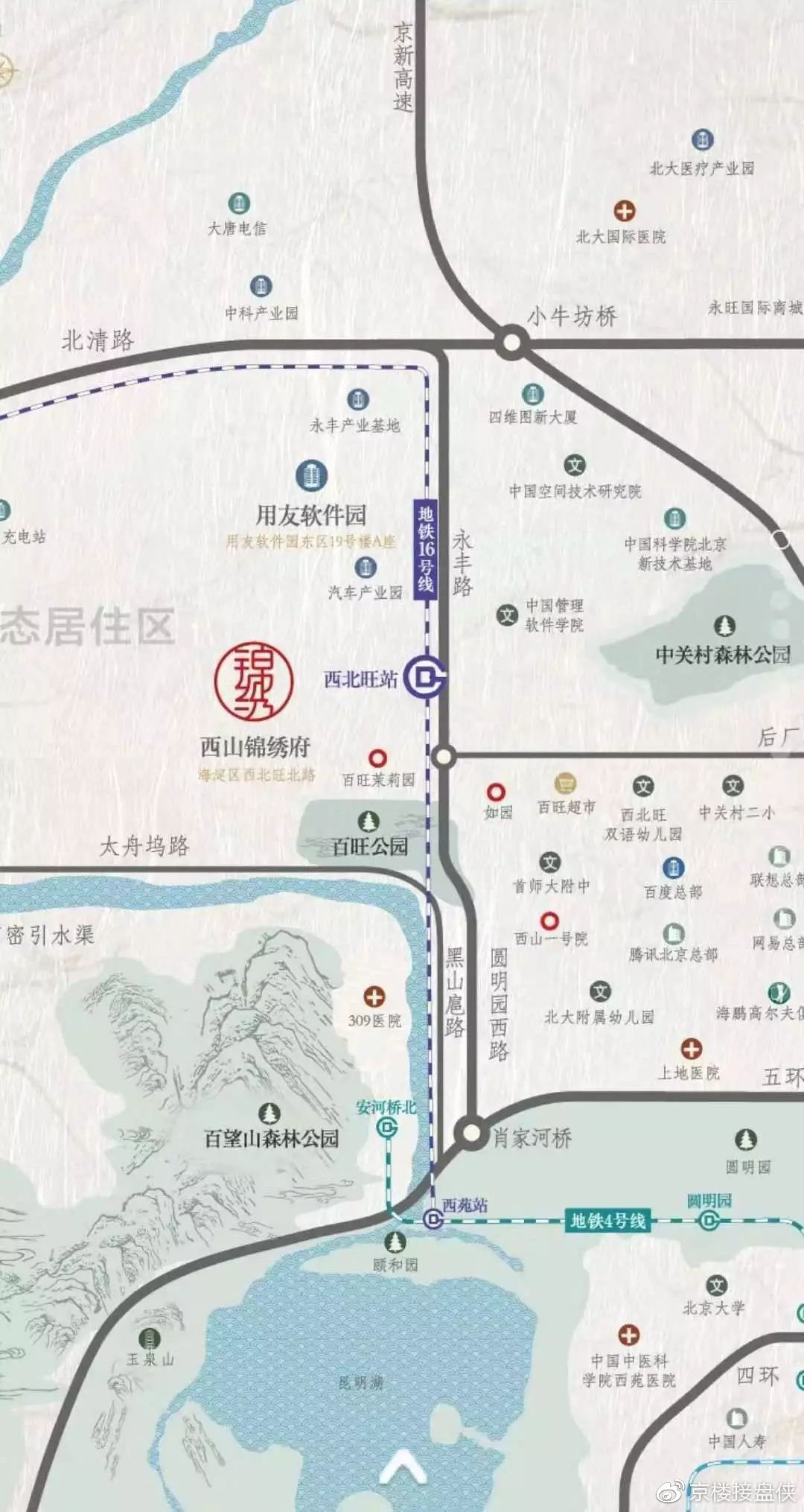 西山锦绣府位于海淀较火的西北旺板块,项目距离地铁西北旺站较近不到1公里,地铁16号线及多条城市主干道,便捷接驳主城;项目南面是京密引水渠和百望山,周边围合1200公顷森林公园,植被覆盖率95%以上,更紧邻10万平米城市绿化、三大公园。而东南侧5公里就是中关村软件园---中国互联网的半壁江山,网易、百度、腾讯、新浪等一票互联网公司;北上3公里是永丰产业园,已有百余家企业入驻。