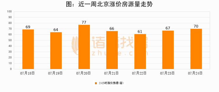 根据诸葛找房数据显示,北京24小时涨价房源量为70套,较07月23日增加3套,环比上涨4.5%。与此同时,涨价房源占比小幅扩大,业主信心有所提升。