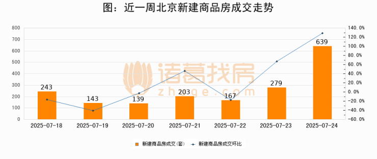 根据北京市住房和城乡建设委员会数据显示,2025年07月24日北京新建商品房成交639套,较昨日增加360套,环比上涨129%