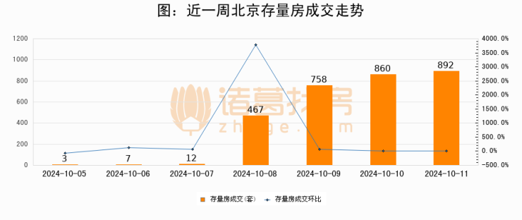 从存量房来看,2024年10月11日北京存量房单日成交892套,比昨日增加32套,环比上涨3.7%。从近一周存量房成交来看,北京存量房日均成交套数为428套,10月11日单日成交892套,高于近一周平均水平108.4%。
