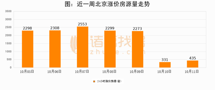 根据诸葛找房数据显示,北京24小时涨价房源量为435套,较10月10日增加104套,环比上涨31.4%。与此同时,涨价房源占比小幅扩大,业主信心有所提升。