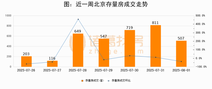 从存量房来看,2025年08月01日北京存量房单日成交507套,比昨日减少304套,环比下降37.5%。从近一周存量房成交来看,北京存量房日均成交套数为507套,08月01日单日成交507套,与近一周平均水平持平。
