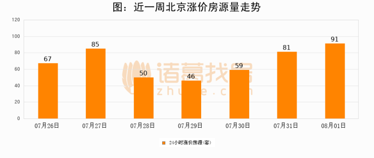 根据诸葛找房数据显示,北京24小时涨价房源量为91套,较07月31日增加10套,环比上涨12.3%。与此同时,涨价房源占比小幅扩大,业主信心有所提升。