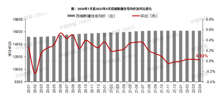 中指研究院公布的数据显示,2022年4月,全国100个城市新建住宅平均价格为16193元/平方米,环比上涨0.02%,涨幅较上月收窄0.01个百分点;同比上涨1.51%,涨幅较上月收窄0.21个百分点。