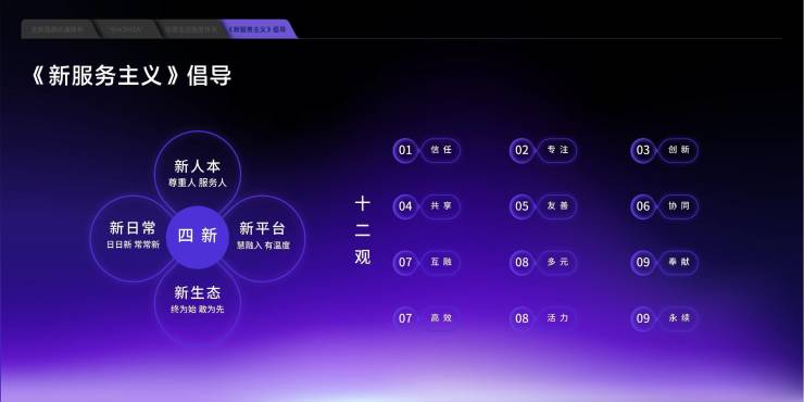 基于多年品质服务的经验沉淀及对业主需求的深入洞察,华侨城服务集团提出新服务主义,以“四新”为核心,通过新人本、新平台、新日常和新生态,打造一个更加人性化、高效化、日常化和生态化的居住环境,同时倡导“十二观”,贯彻信任、专注、共享、创新等服务价值观,与业主共同构建一个和谐、便捷、持续发展的社区生活。