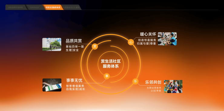 “赏生活”社区服务体系,以马斯洛需求层次理论为基石,精心构筑服务生态,全方位、多层次地满足业主的每一个生活向往:基础服务“品质共赏”,以高品质、高标准的服务确保业主的生理与安全需求得到坚实保障;惊喜服务“暖心关怀”,传递爱与尊重,让每一位业主感受到家的温暖与归属感;社群运营“乐邻共创”,促进业主间的相互认知与理解,激发社群活力,共同提升审美情趣与生活品质;智慧增值“事事无忧”,通过科技赋能,让生活更加便捷高效,助力每一位业主在追求卓越的道路上不断前行。