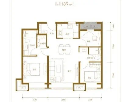 89平米的中间户型,南向三面宽,客厅落地窗,通透性和采光都很赞。南向双卧都有飘窗,卧室双套间设计都带卫生间,餐客厨一体化设计。缺点是主卧并不通透,不过也算是难得的优质户型了,销量也不错。