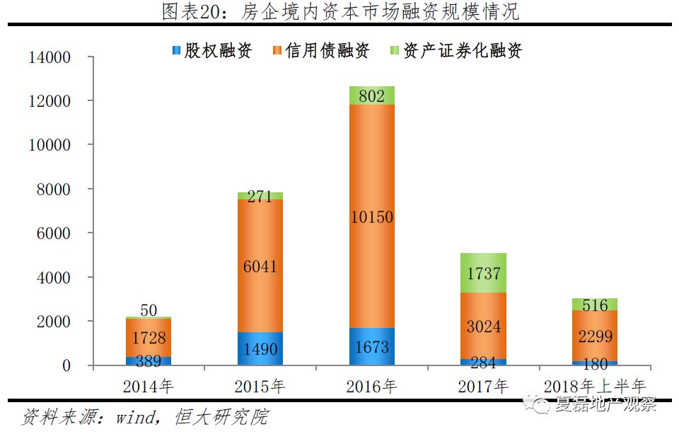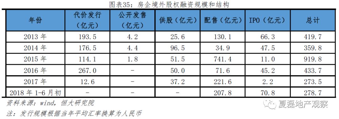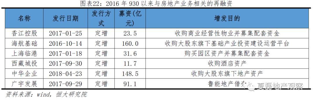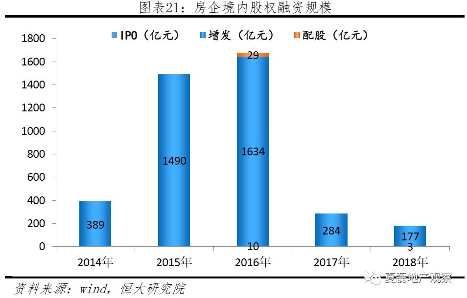 2010年4月,《国务院关于坚决遏制部分城市房价过快上涨的通知》规定,对存在土地闲置及炒地行为的房企,证监部门暂停批准上市、再融资和重大资产重组,房企境内IPO和再融资暂停。2014年3月起,证监会就房企再融资申请,向国土部和住建部征求意见,房企再融资重启。2015年1月,证监会和国土部不再对上市公司涉及房地产业务的再融资进行事前审查,房企再融资进一步放开。叠加货币政策宽松和房地产去库存,房企增发规模大幅度提高:2015年房企增发1490亿,是2014年的3.8倍,2016年进一步攀升至1634亿。2016年7月,证监会保荐机构专题培训会议要求,不允许房企再融资补充流动资金、拿地和偿还银行贷款,叠加930开启的房地产调控,2016年930以来,除个别资产并购,房企再融资实质性暂停。房企定增规模明显回落:2017年增发284亿,同降83%;2018年股权融资规模至今只有180亿元,维持低迷状态。
