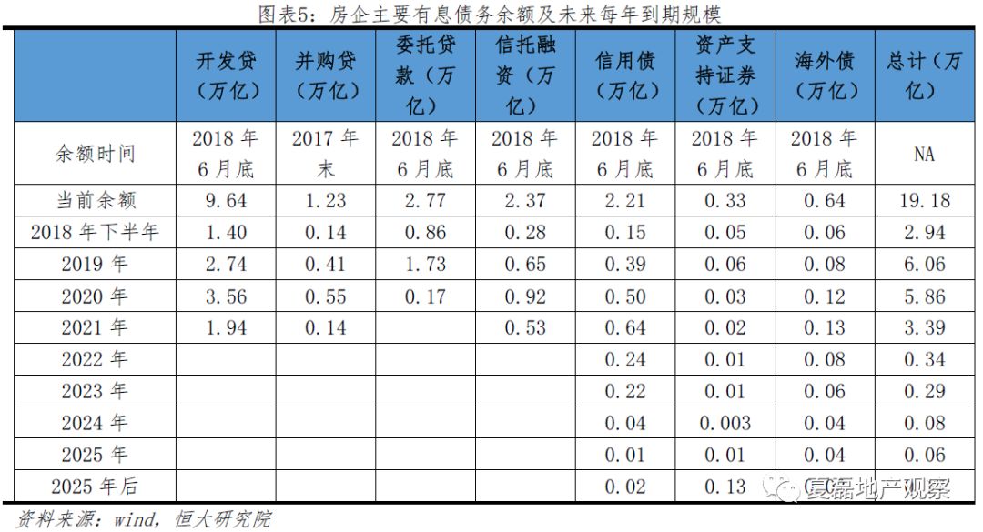 截止2018年上半年末,房企主要有息负债余额19.2万亿,规模从大到小依次是房地产开发贷、委托贷款、信托融资、信用债、并购贷、海外债和资产支持证券,余额分别为9.6万亿、2.8万亿、2.4万亿、2.2万亿、0.6万亿和0.3万亿。