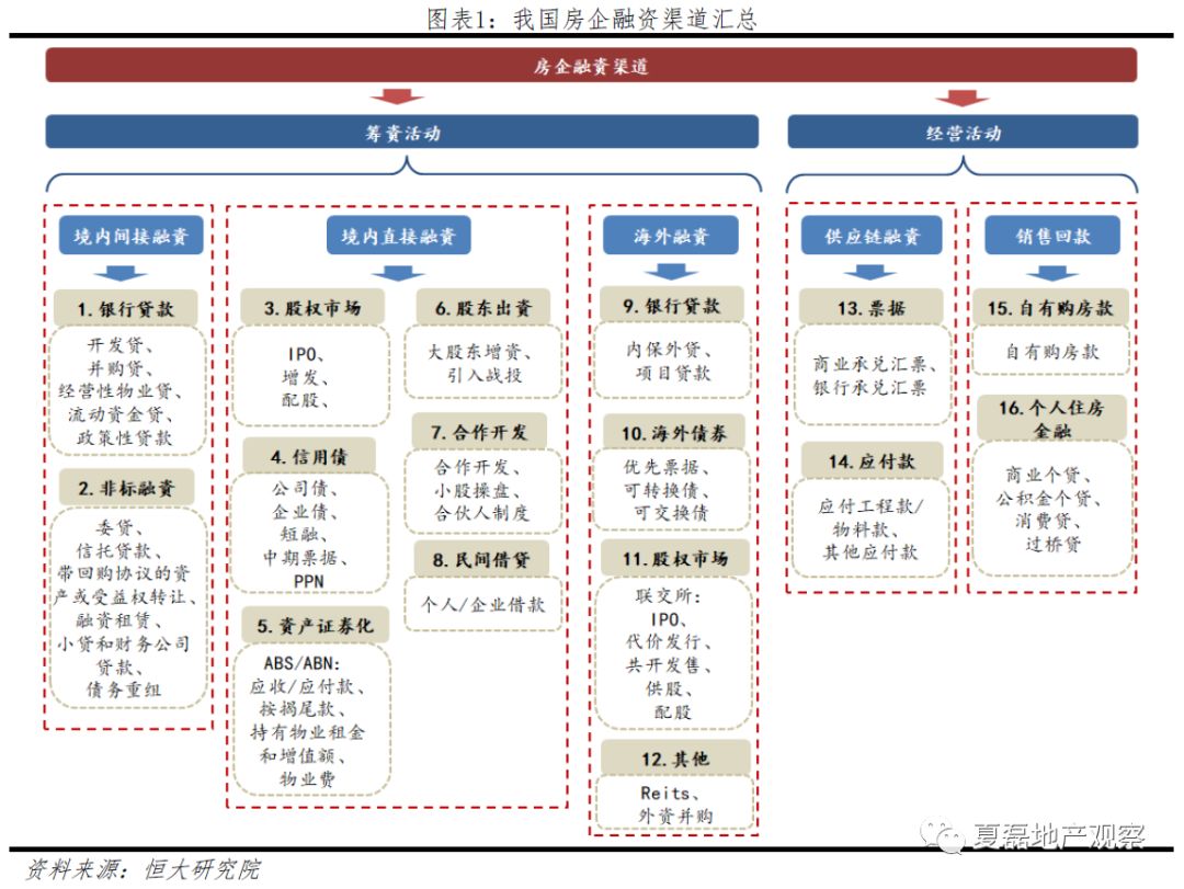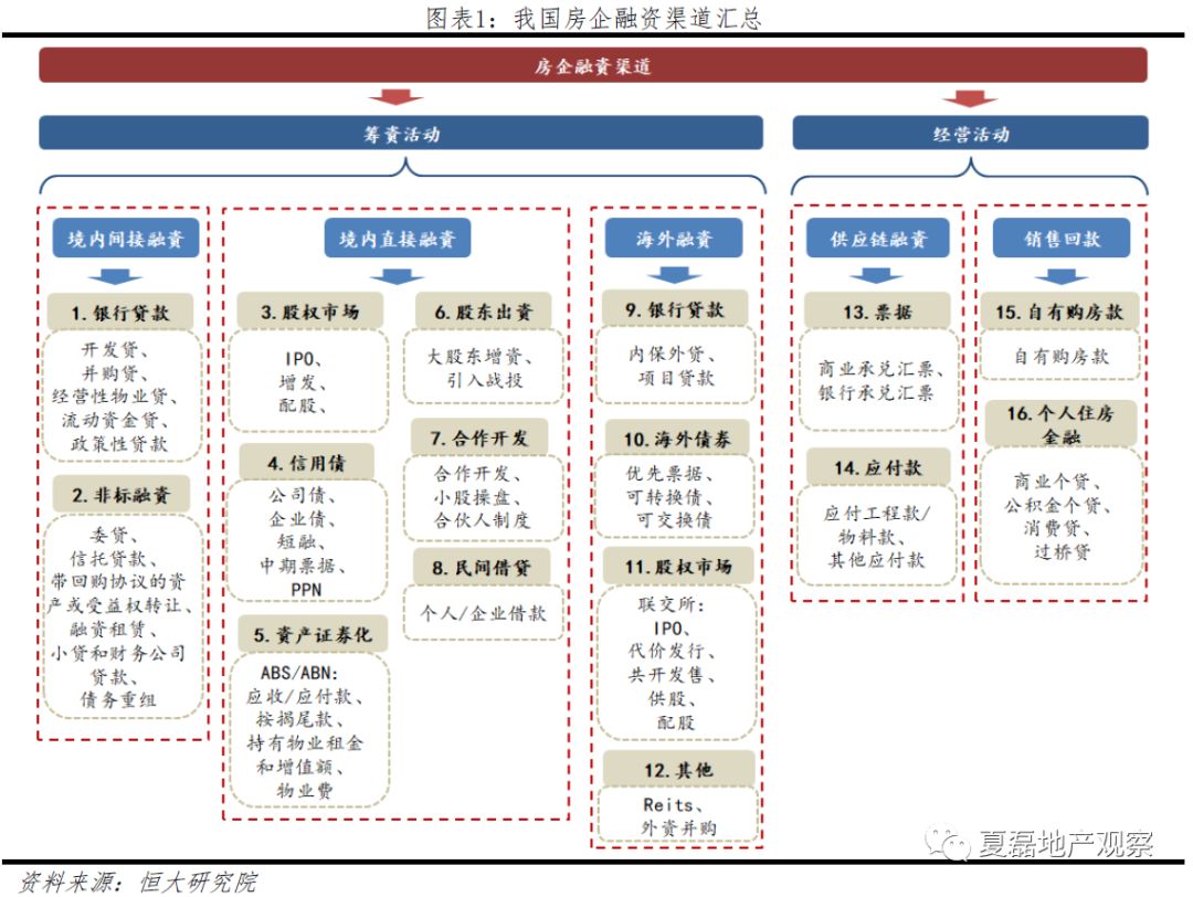 房地产行业已形成5大类、16小类、近50类细项的多元化融资渠道。其中,筹资活动包括境内间接融资、境内直接融资和海外融资3大类,共12小类融资渠道;经营活动包括供应链融资、销售回款2大类、共4小类融资渠道。