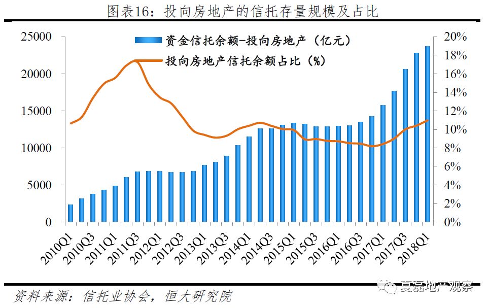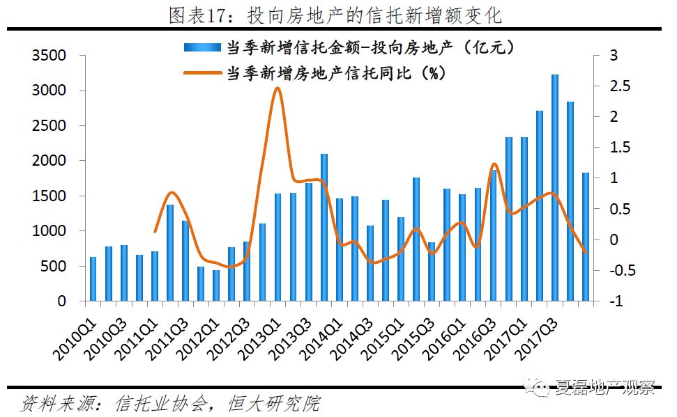 2016年三季度至2017年,证监会收缩下辖金融机构房地产业务,通道业务回流信托。证监会从2016年中连续发文限制券商资管和基金子公司通道业务,2016年末银监会对热点16城开展金融机构房地产业务专项检查,2017年2月中旬基金业协会叫停16城私募、资管计划投资房地产开发项目。从2016年三季度开始,通道回流房地产信托,新增规模快速增加。2017年,房地产信托新增1.1万亿,同增51%,创2010年以来新高。2017年末,房地产信托存量2.3万亿,创历史新高,占信托存量10.4%,也是2015年以来峰值。