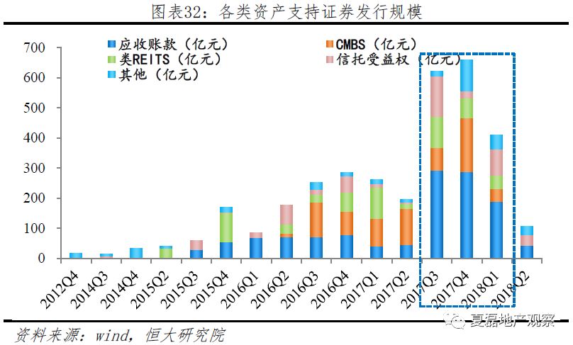 传统融资渠道受限,房企开拓创新融资方式,资产支持证券发行量从2017年开始快速增长,全年发行1737亿,同增117%,2018年1-5月中旬共发行517亿元,规模持续增长。