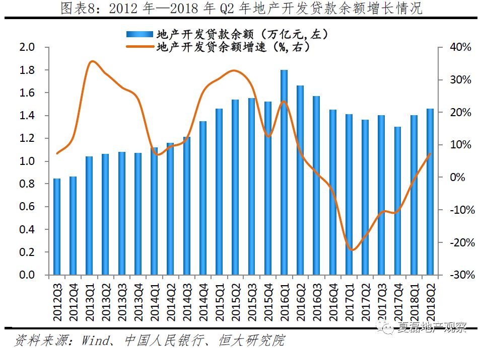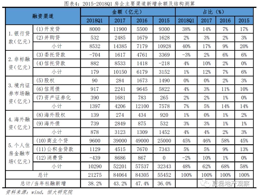 从总量看,2016年房地产融资新增余额达到峰值后,正平稳回落。2016年8.43万亿,同比大幅增长53%,2017年8.41万亿,同比回落0.3%;占当年新增社融的比例,2016年47%、大幅增加11个点,此后持续回落,2017年和2018年一季度分别为43%和38%。