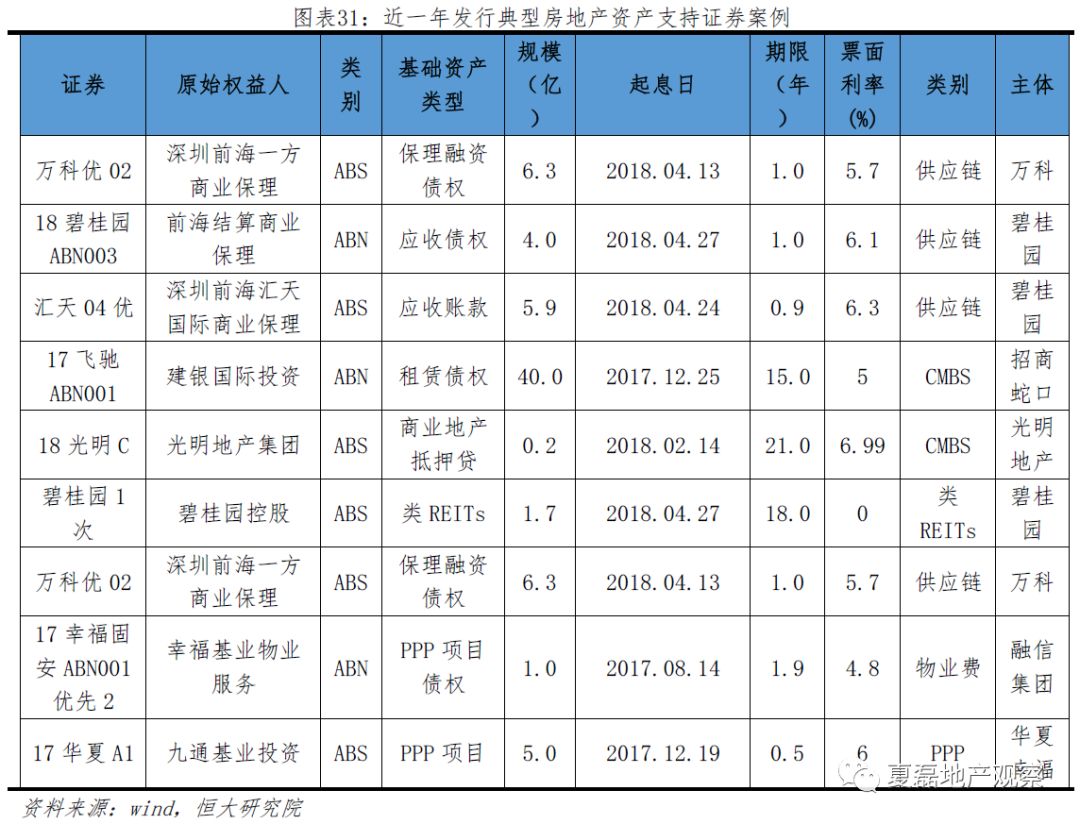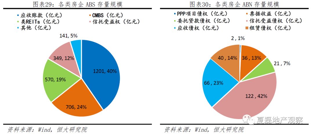 房地产企业资产支持证券主要包括证监会主管ABS、交易商协会主管ABN两大类。ABS是房企资产证券化的主要发行产品,存量规模2967亿元,占比91%,ABN存量为287亿元,占比9%。