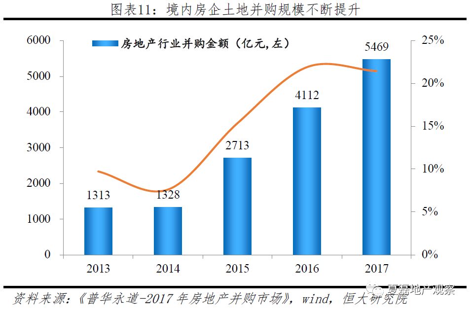 2015年以来,房地产并购无论是总规模还是在拿地金额占比,均快速增加。2017年全国房地产行业并购总金额5469亿元,同增33%;占全年土地购置费比例达21.4%。按照并购贷款较高占交易价款60%的规定,2017年房地产行业并购贷规模估计达到3281亿元。