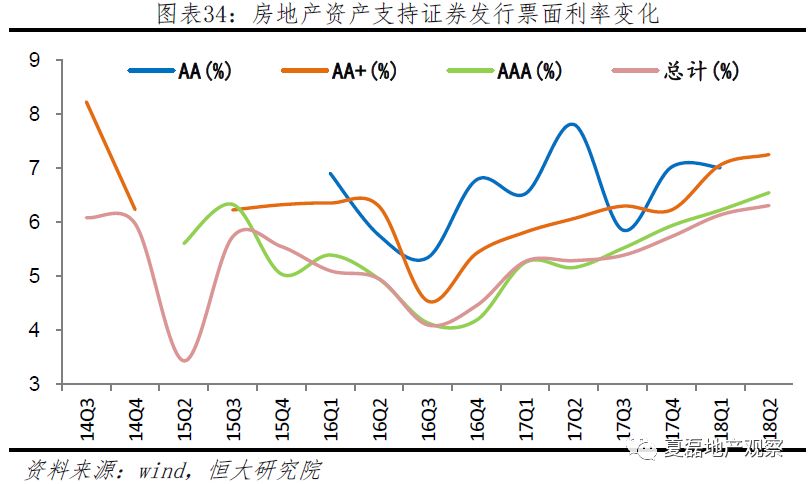 房地产传统融资渠道收紧,房企对资产支持证券融资需求快速增加,推动 2017年以来发行利率持续上升。以AA+级资产支持证券为例:2014年流动性紧张,发行量少、融资成本较高;2015至2016年,受益市场资金充裕、房地产融资政策宽松,平均发行利率持续下降至4%-5%; 2017年开始,随着房地产传统类融资的政策收紧,资产支持证券发行规模快速上升,推升融资成本, 2018Q2发行的票面利率达7.2%。