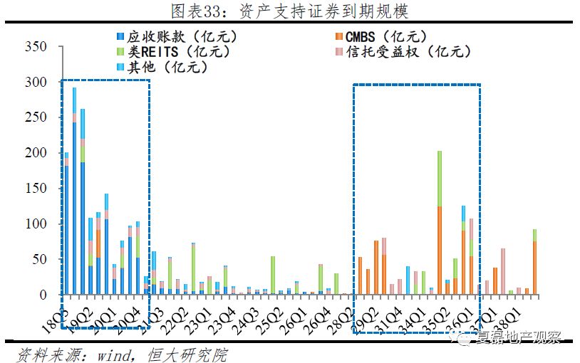 由于总发行规模有限、期限较为分散,资产支持证券到期偿付压力不大。房企发行的资产支持证券中,类Reits和CMBS期限很长,在10-20年之间,其他以3年期以内为主。因此,存量房地产资产支持证券有两个集中兑付期,一是在2018年3季度至2020年4季度有1438亿到期,二是2034-2017年有684亿到期。