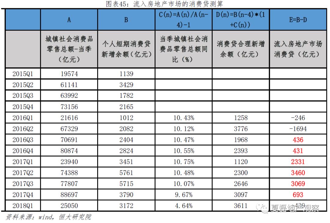经测算,2016年下半年和2017年,流入住房市场的个人短期消费贷规模分别为867亿和9552亿。方法为,用当季社会商品零售总额同比,作为同期个人短期消费贷的合理同比增幅,计算消费贷的合理新增余额。再用消费贷实际新增余额,减合理新增余额,得到流入房地产市场的消费贷规模。