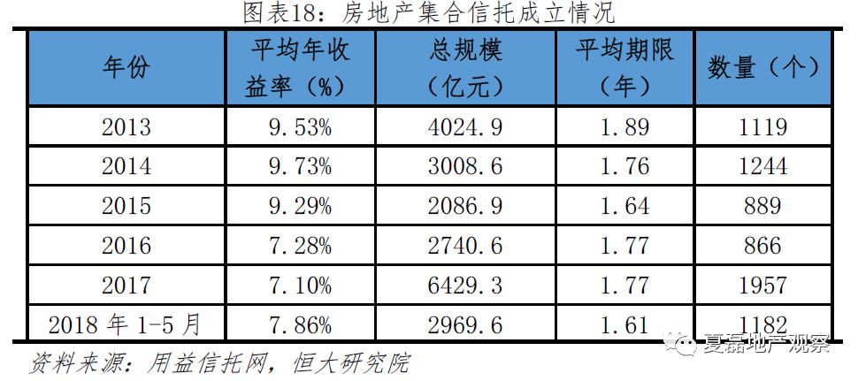 监管减少房地产信托资金供应,推动房企信托融资成本持续上行。资管新规严禁投资非标债权和未上市股权的资管产品期限错配,使新成立的信托期限缩短。2018年1-5月,新成立的房地产集合信托,平均收益率7.86%,较2017年上升0.76个百分点;平均期限1.61年,较2017年缩短0.16年。