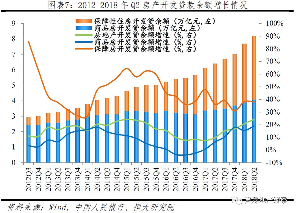 房产开发贷余额持续增长,截止2018年6月底,全国房产开发贷余额8.2万亿,比2017年6月底增长27.8%。房地产开发贷余额增速并没因为政策收紧而降低,反而从2017年Q2开始加速增长,其中商品房开发贷余额增速从2017年Q1开始由负转正,呈上升趋势。