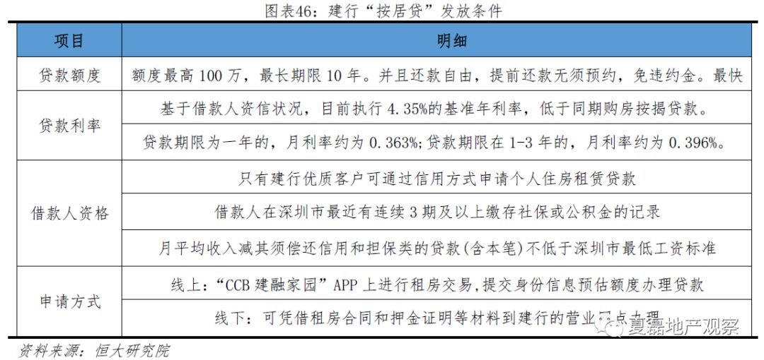 以“按居贷”为例,2017年11月3日,深圳建行与招商地产、华润、万科等11家房企合作推出5000多套长租房源,并开创性的推出针对个人租房者的贷款产品——按居贷。按居贷面向租客,用于一次性支付租金等租房相关费用的贷款,具有以下特点:1)额度高期限长:按居贷较高额度可达100万,较长期限10年。2)利率低:目前执行4.35%的基准年利率,低于同期购房按揭贷款。3)手续便捷:可通过“CCB建融家园”APP直接进行租房交易,提交身份信息即可预估额度、办理贷款。