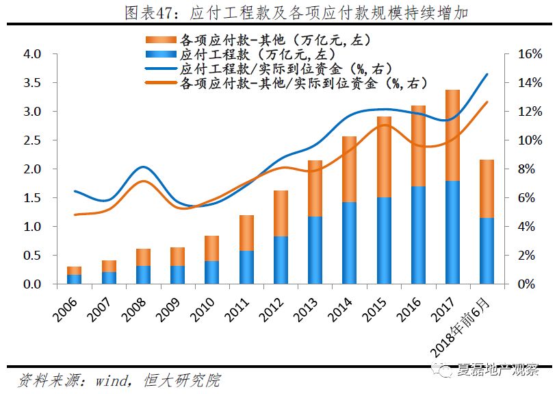 (6)商业信用融资。应付款和应付票据融资规模增长、成本较高。全国房企各项应付款(包括应付票据)是开发资金来源的22%左右,2017年融资3.4万亿,创历史新高。目前民营房企商票贴现和应付款融资成本达10%及以上。