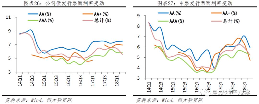由于监管趋严、信用政策偏紧和债市回落,2017年房企发债成本上升;2018年上半年,受益资金面改善,成本小幅回落。以新发行AAA级公司债和中票票面利率为例,2016Q4为4.7%和3.8%,2017Q4大幅提升至6.3%和5.6%, 2018年Q2小幅回落至5.8%和5.2%。紧信用下融资持续紧张,宽货币部分对冲成本上行压力,预计下半年房企信用债成本基本稳定或小幅回升;同时,不同评级的债券利差扩大。