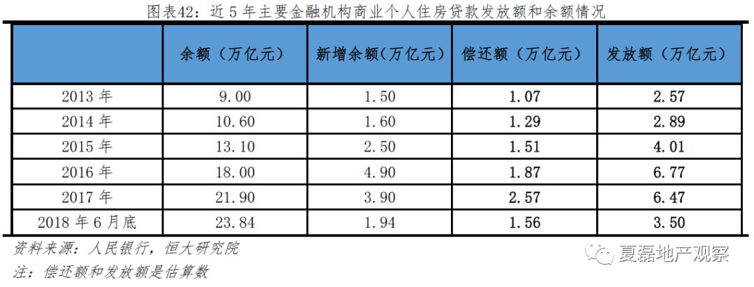 (5)个人住房金融。A.商业个贷额度持续收缩、首付上升、利率上浮明显。2018年6月,首套房平均首付30%、利率5.6%,二套房平均首付50%,利率6%;上半年新增余额1.94万亿,同比-7.6%、环比7.8%。B.公积金个贷政策收紧、发放额减少。房价上涨、贷款额度偏低、条件收紧,2017年发放额同减25%。C.消费贷流入住房市场。严格限贷后,消费贷被违规用于购房。2016和2017年流入住房市场的消费贷,分别占房贷的1.1%和12.9%。