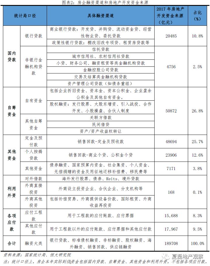 已形成5大类、16小类、近50细项的多元化融资体系。2017年全国新增房地产开发资金19万亿,占比较高的依次是销售回款、自筹资金、应付账款、国内贷款和其他资金,对应的主要融资渠道包括个人住房金融、非标融资、银行贷款、境内外证券市场融资、应付款融资。
