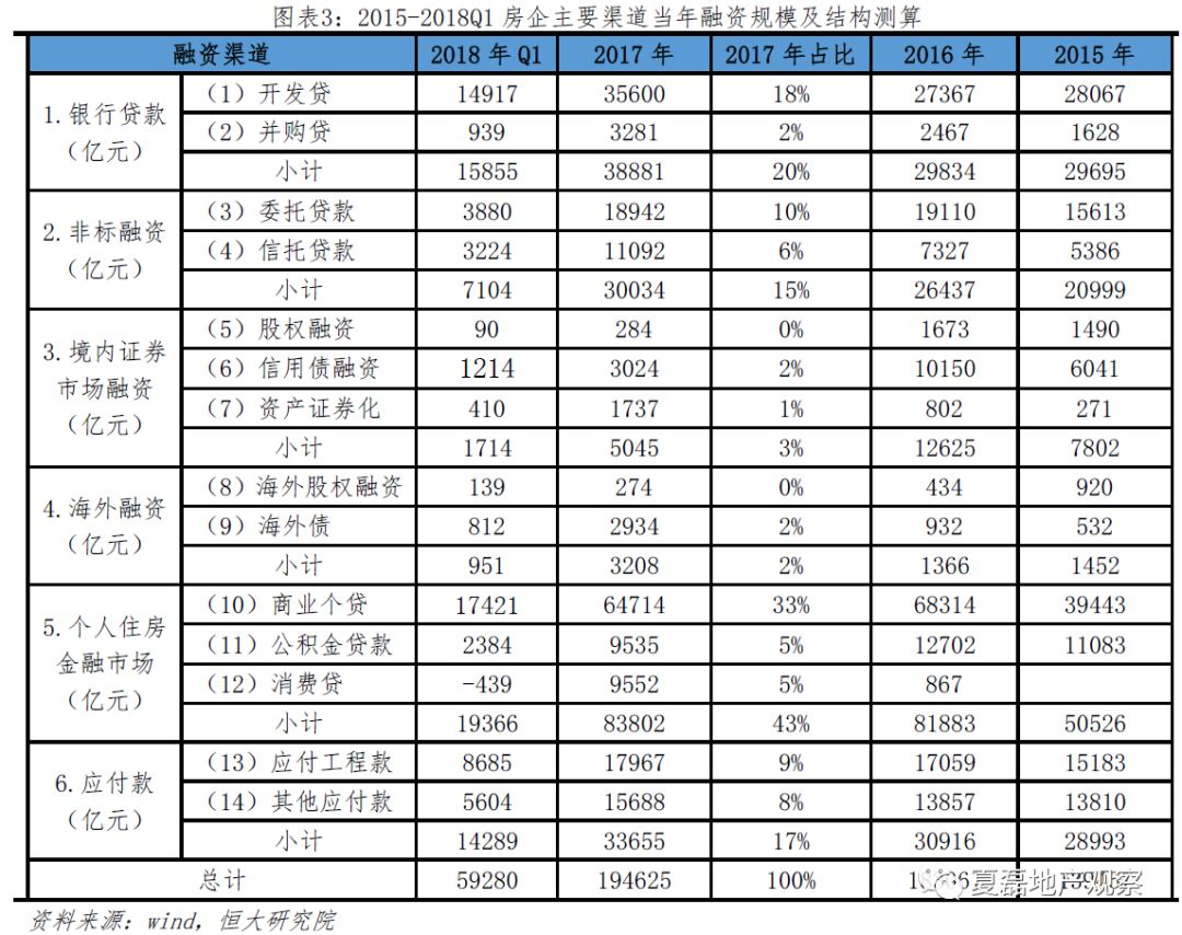 从总量上看,房企融资规模持续增长,2015年至2018年一季度分别为13.9万亿、18.3万亿、19.5万亿和5.9万亿。