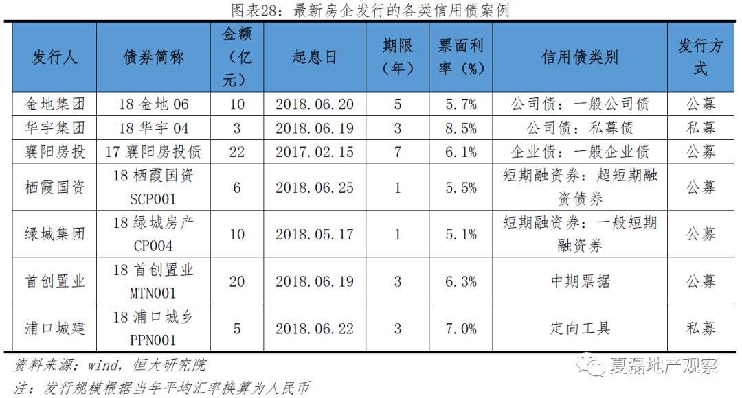 2016年10月开始,房企发债政策收紧,信用债发行规模回落。10月,交易所发布《关于实施房地产、产能过剩行业公司债券分类监管的函》,开始将房企分三类监管,提高房企发行公司债标准,并限制资金用于偿还债务、项目建设和补充流动资金,要求详细披露项目情况、定期披露资金使用情况。11月,发改委出台《关于企业债券审核落实房地产调控政策的意见》,严格限制房企业发行企业债券融资,用于商业性房地产项目。2018年1月,交易所对房企公司债窗口指导,房企发行公司债仅限用于偿还原有公司债。
