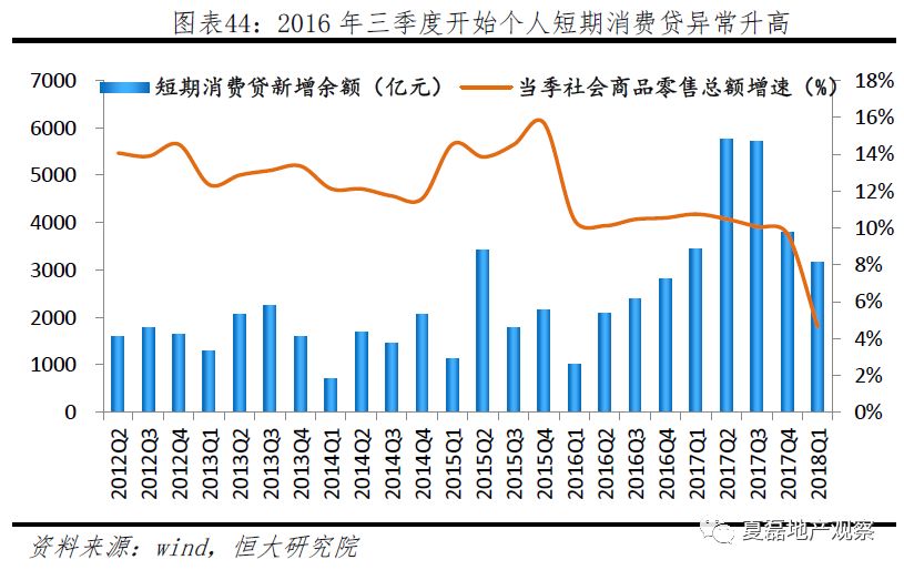 热点城市严格限贷,部分住房贷款需求转向消费贷,居民短期消费贷开始大量流入购房市场。从2016年三季度开始,居民短期消费贷新增余额快速增加,而同期的社会商品零售总额同比增幅则维持低位。