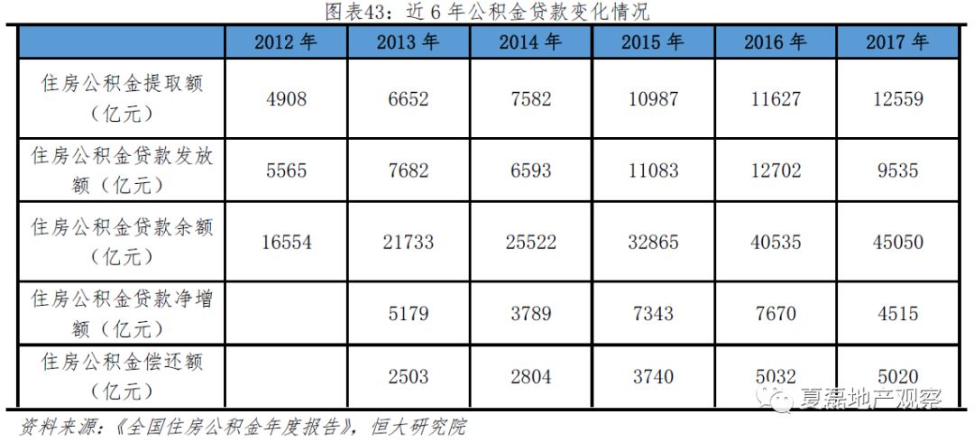 2015-2016年,公积金支持居民购房力度大增,发放额和余额均快速增长。2017年,房价快速上涨,公积金政策收紧,个人住房公积金贷款余额45050亿元,发放额9535亿元;分别增长11%和减少25%。