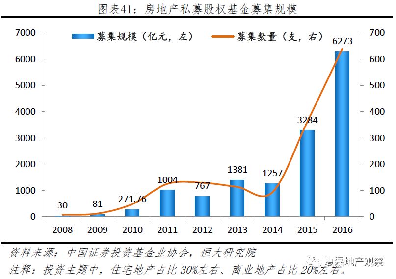 2015年以来房地产基金规模快速增长。2016年房地产基金募集数量达到641支,规模达到6273亿元,成为私募基金市场中的重要组成部分。2017年新备案510只地产基金,承诺募资规模回落至3000亿,存量规模仅小幅增长。房地产市场景气度和行业政策,决定房地产基金走势。2015-2016年规模快速增长,受益于房地产市场景气度攀升、融资需求迅速增加,以及房地产融资政策放松。2017年新增规模回落,主要原因在于,一二线城市房地产市场回落、政府严格的地产行业严格调控、金融去杠杆去通道。2018年行业和政策趋势不变,预计地产基金增量将持续回落。