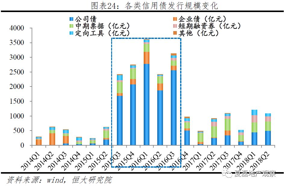 房企信用债发行在2015年3季度到2016年3季度处于井喷期,共发行信用债14346亿,其中公司债11014亿。这一方面得益于期内房企融资政策宽松;另一方面得益于2015年1月实施的《公司债券发行与交易管理办法》,扩大发行主体范围,明确债券发行种类,丰富债券发行方式,简化发行审核流程。