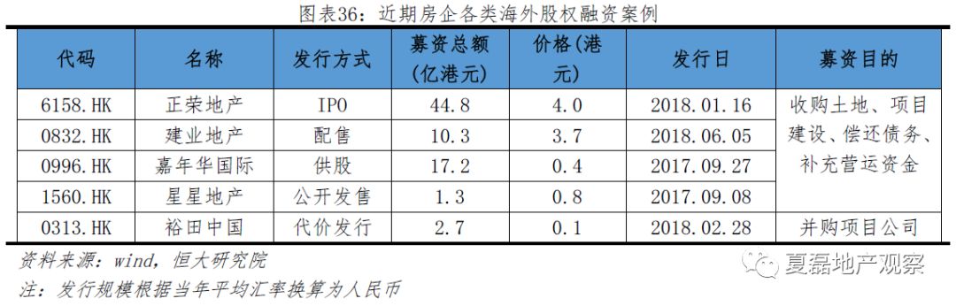 中国香港是中国企业海外融资较先考虑的地方,大量中资房企在香港联交所上市和再融资,再融资包括配售、供股、代价发行、公开发售融资、行使认股权证和股份认购权计划,后两类使用较少。