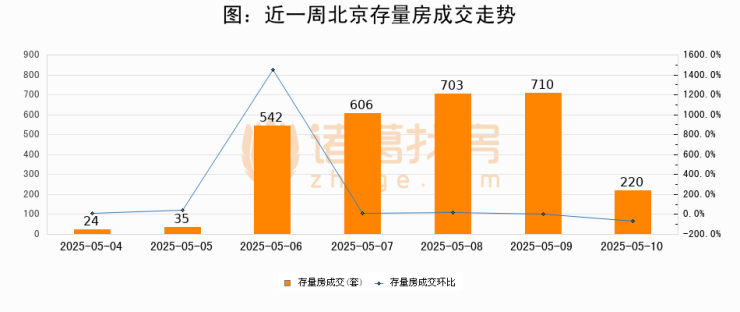 从存量房来看,2025年05月10日北京存量房单日成交220套,比昨日减少490套,环比下降69%。从近一周存量房成交来看,北京存量房日均成交套数为405套,05月10日单日成交220套,低于近一周平均水平45.7%。