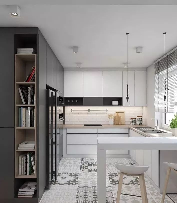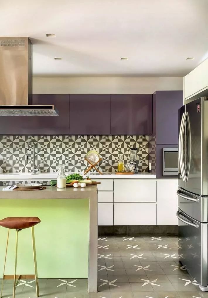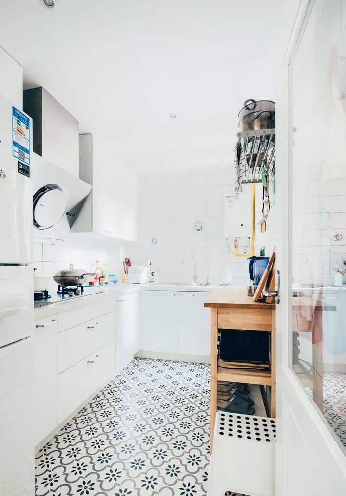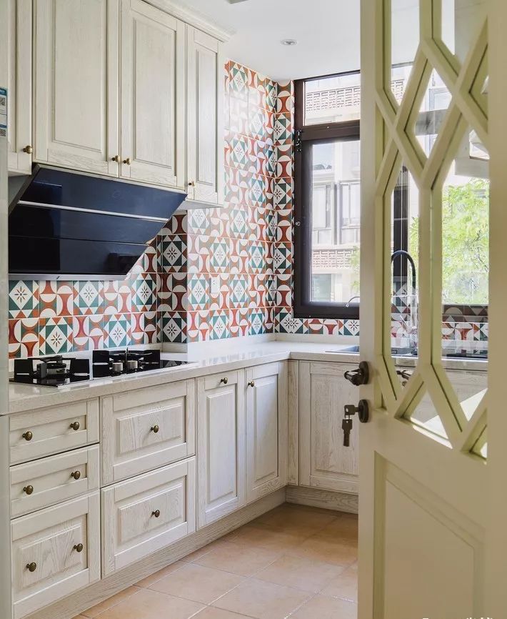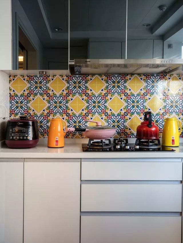 厨房的墙面一般比较单调,实用性远远胜过了装饰性,因而没有太大的亮点。如果用花砖进行装饰,和其他单色砖形成一个视觉上的对比,或许就能轻松打造视觉焦点了。