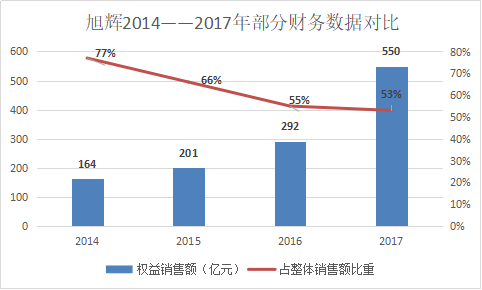 2014年至2017年,旭辉分别实现权益销售额164亿、201亿、292亿和550亿。但是权益销售占整体销售额的比重则从2014年的77%逐年下降为66%、55%和53%。