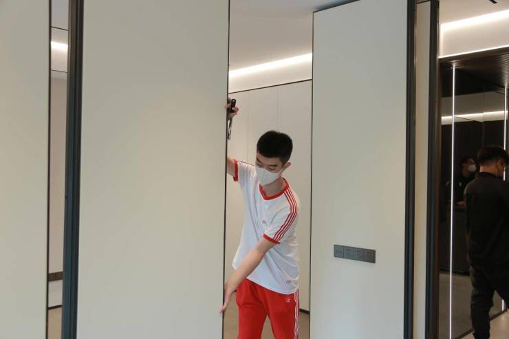 就部分媒体提出的移动隔墙是否隔音的问题,工作人员现场进行了隔音效果测试。据现场工作人员介绍,紫金书院专利户型采用的移动隔墙有内置隔音棉、整片隔音钢板、基层木板,表面有装饰面板,另有空气腔、子母密封槽、橡胶隔音条等细节措施用于隔音,满足国标要求的隔音效果。