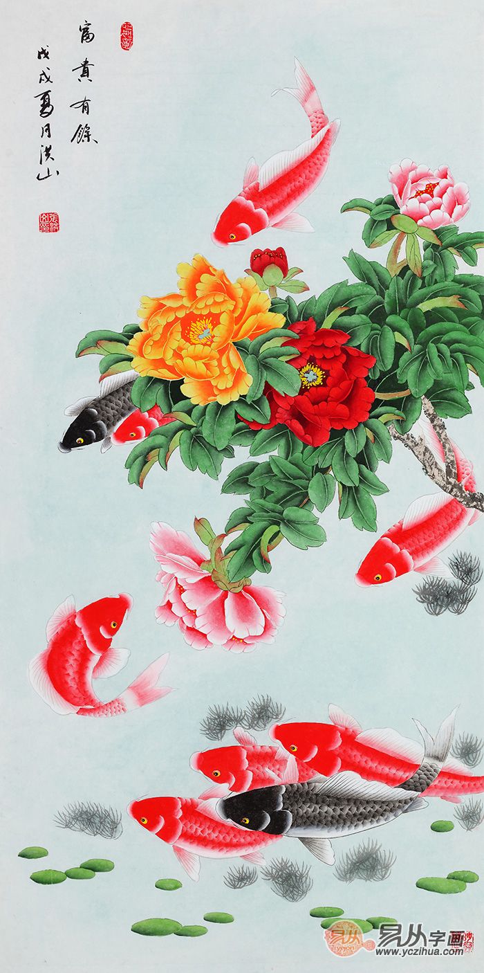张洪山牡丹九鱼图《富贵有余》(作品来源:易从网)