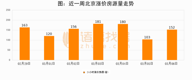 根据诸葛找房数据显示,北京24小时涨价房源量为152套,较03月05日增加49套,环比上涨47.6%。与此同时,涨价房源占比小幅扩大,业主信心有所提升。