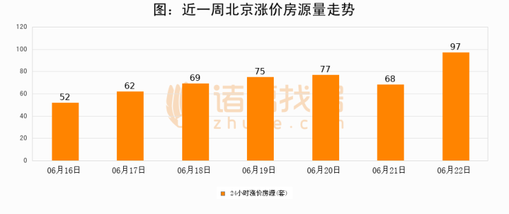 根据诸葛找房数据显示,北京24小时涨价房源量为97套,较06月21日增加29套,环比上涨42.6%。与此同时,涨价房源占比小幅扩大,业主信心有所提升。