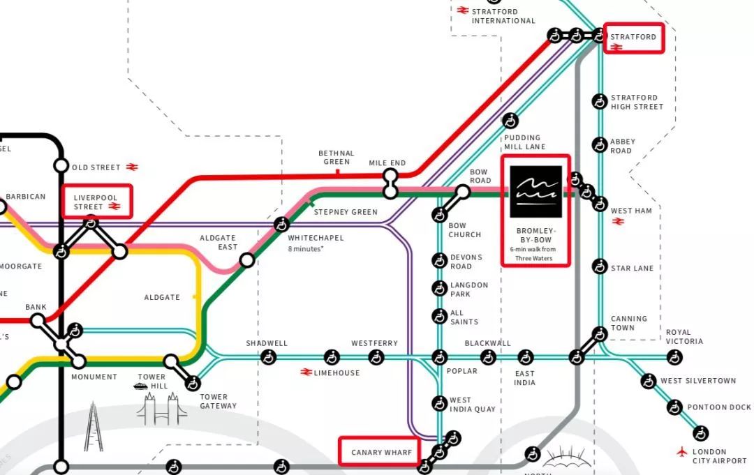 金淼水岸(Three Waters)步行即达堡贝门利社区Bromley-By-Bow站点、德文路码头区轻轨站Devons Road DLR。