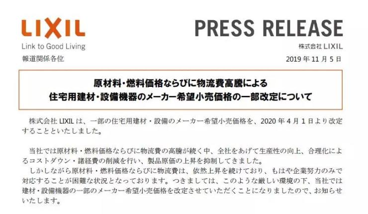 近日,骊住公司宣布将在2020年4月1日起上调部分产品的建议零售价。骊住在公告中表示,在原材料、燃料价格及物流费用高企的情况下,公司通过提高生产效率、削减经费等方式抑制生产成本增加。但由于原材料、燃料及物流费用仍在上升,仅靠企业应对已十分困难,因此作出涨价决定。