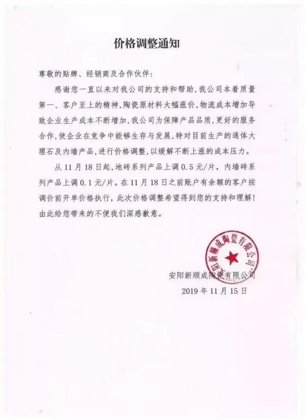 临近年末,国内陶企开始涨价