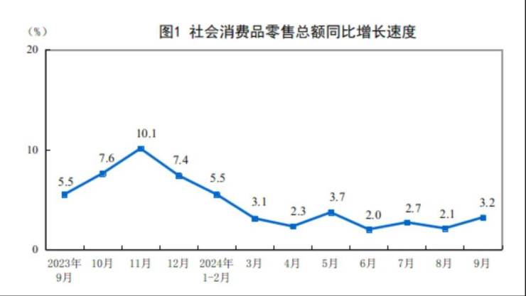 前三季度,社会消费品零售总额353564亿元,同比增长3.3%。9月份,社会消费品零售总额同比增长3.2%,比上月加快1.1个百分点;环比增长0.39%。